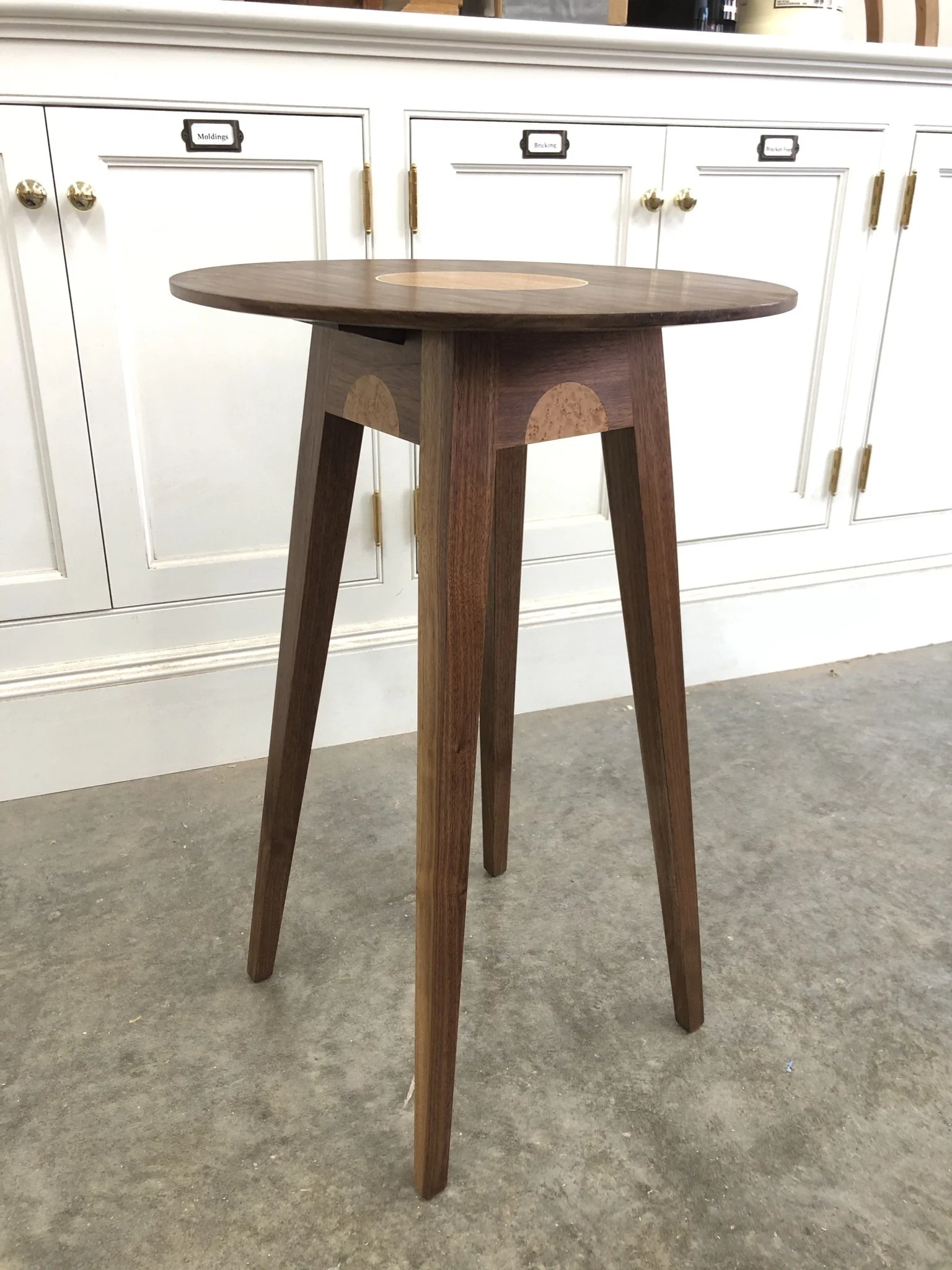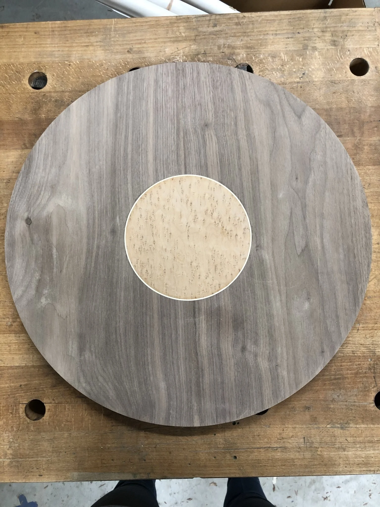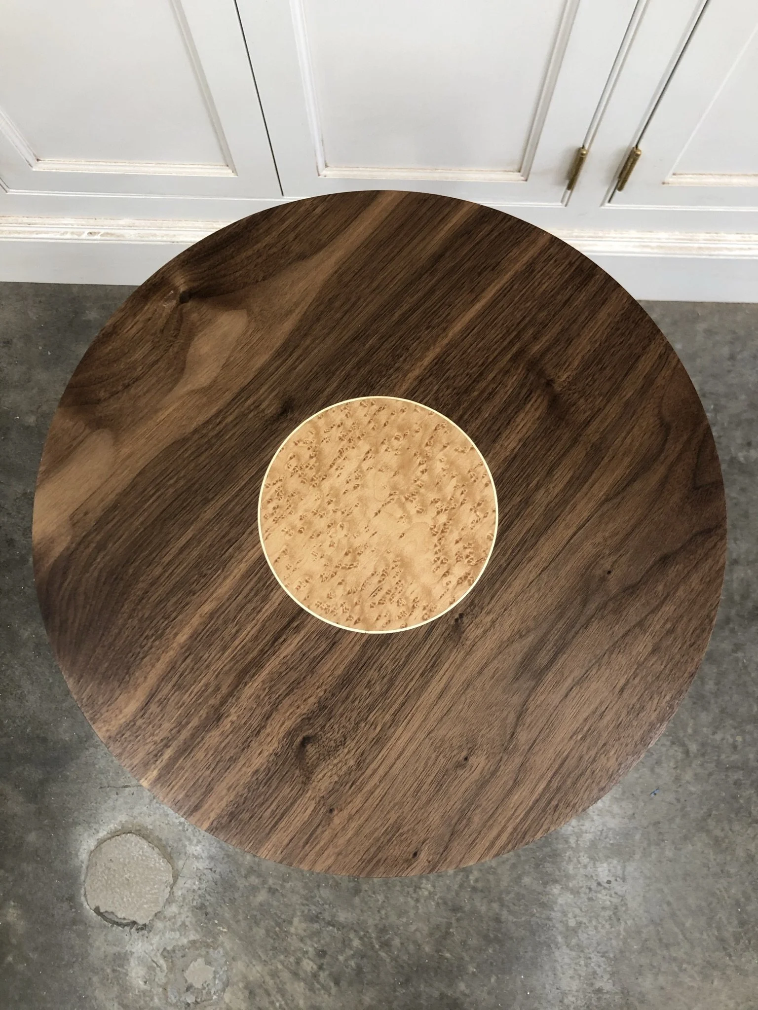 2021. Walnut, birdseye maple, holly. Urethane. Tabletop has 17 3/4” diameter. Table is 27 1/4” H.